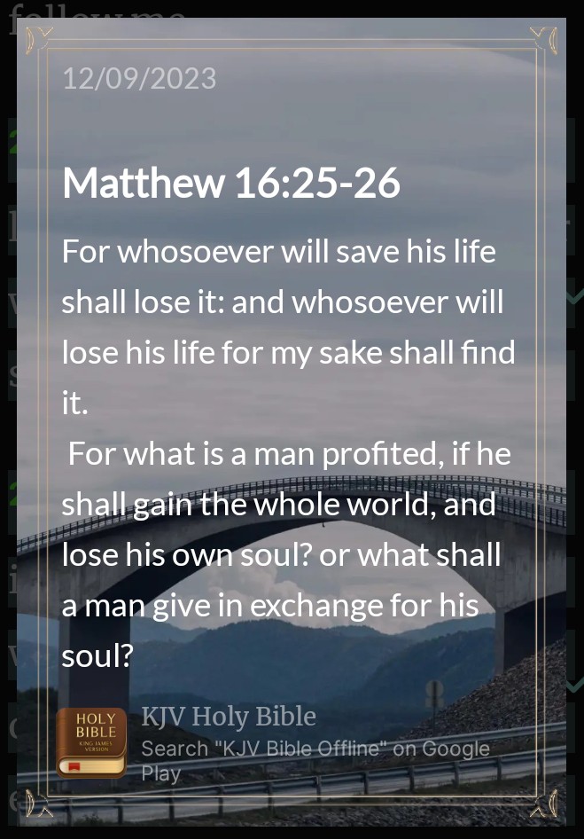 Matthew 16:25-26″For whosoever will save his life shall lose it: and whosoever will lose his life for my sake shall find it.For what is a man profited, if he shall gain the whole world, and lose his own soul? or what shall a man give in exchange for his soul?”.